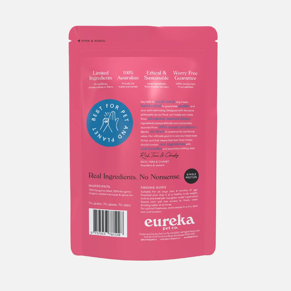 We are proud supporters of Australian businesses and farmers! Over 99% of Eureka dog food recipes are made from Australian-sourced ingredients. All our proteins are Australian sourced - from sustainably harvested Kangaroo, Wild Venison and Wild Boar to free-range Chicken and grass-fed Lamb.