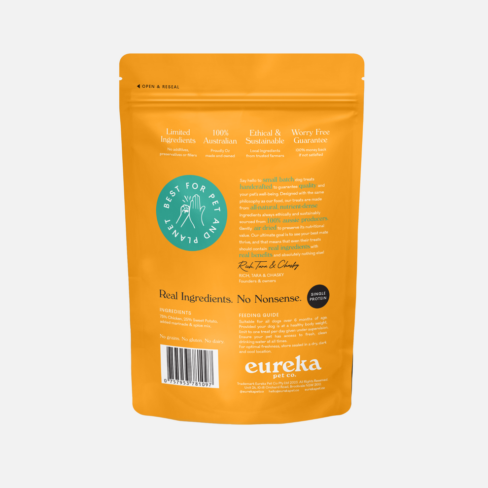 Unlike raw, Eurekas' unique air-drying process involves a "kill step," which eliminates pathogens, removing any food safety risks and making your dog’s ongoing health a priority. We utilise solar oven technology to significantly reduce our energy consumption and impact on the environment. This process means Eureka dog food is dry enough to last for weeks after opening but has enough moisture to eat without any additional preparation. You'll notice that you feed a lot less on Eureka air dried dog food because there are zero fillers which means you'll also be picking up a lot less poo!