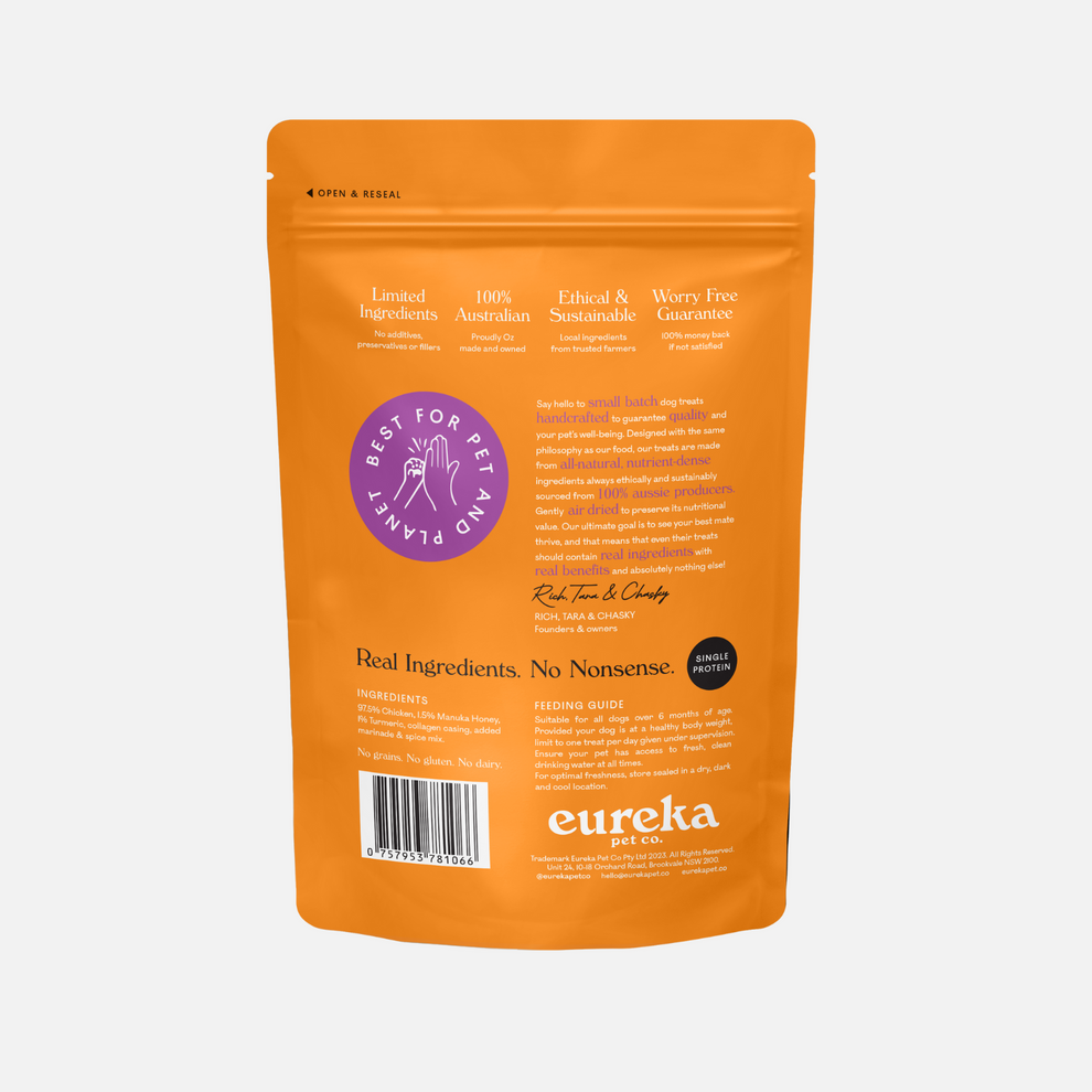 Unlike raw, Eurekas' unique air-drying process involves a "kill step," which eliminates pathogens, removing any food safety risks and making your dog’s ongoing health a priority. We utilise solar oven technology to significantly reduce our energy consumption and impact on the environment. This process means Eureka dog food is dry enough to last for weeks after opening but has enough moisture to eat without any additional preparation. You'll notice that you feed a lot less on Eureka air dried dog food because there are zero fillers which means you'll also be picking up a lot less poo!