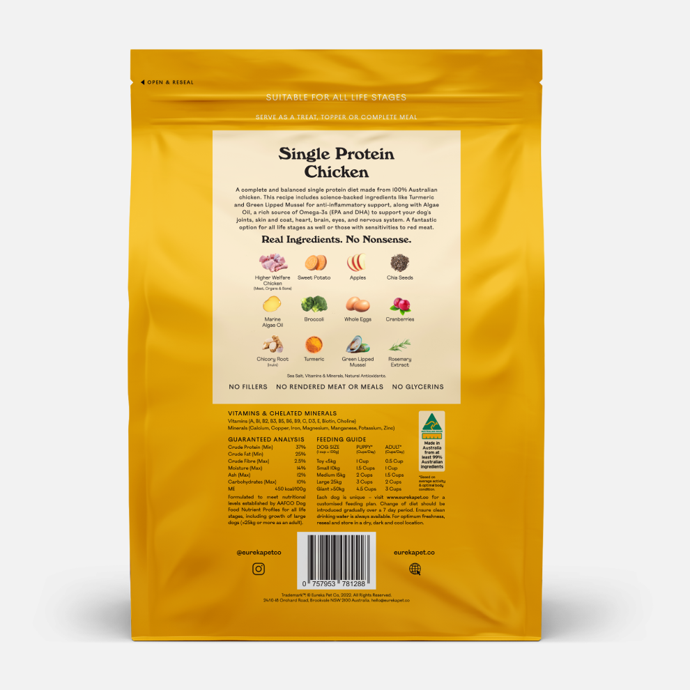 Support your dog's digestive health and vitality with Eureka’s Single Protein Chicken air dried dog food. Made 100% in Australia from locally and ethically sourced ingredients including green lipped mussel, marine algae oil, sweet potato, cranbery and turmeric to support joint health. Ideal for senior dogs and those with red meat sensitivities. Natural prebiotics and added postbiotics provides functional gastro-intestinal support and promotes healthy microbiome in the gut.