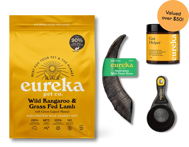 In Eureka recipes every ingredient has a purpose. Our focus is 90% real Aussie meat, 10% whole food veg, fruit and seeds and 0% anything else. We've included everything your dog needs to thrive and avoided unnecessary fillers and common commercial shortcuts like glycerin and artificial preservatives.
