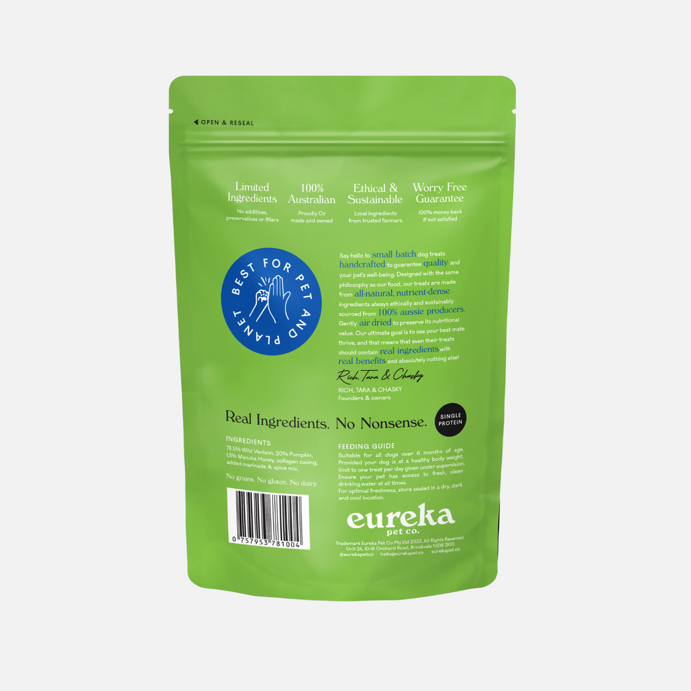 We are proud supporters of Australian businesses and farmers! Over 99% of Eureka dog food recipes are made from Australian-sourced ingredients. All our proteins are Australian sourced - from sustainably harvested Kangaroo, Wild Venison and Wild Boar to free-range Chicken and grass-fed Lamb.